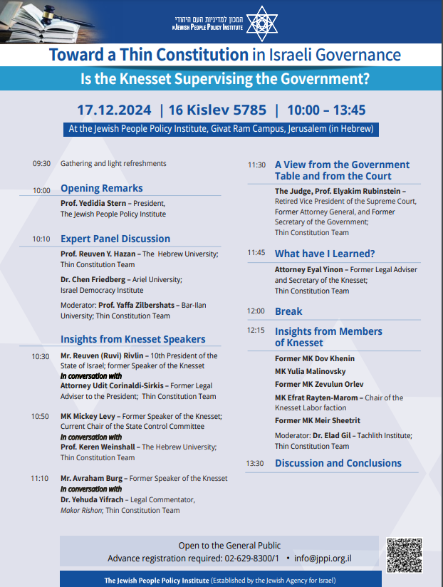 As part of JPPI’s Toward a Thin Constitution project, a conference will be held to examine whether the Knesset in its current state adequately oversees the government.