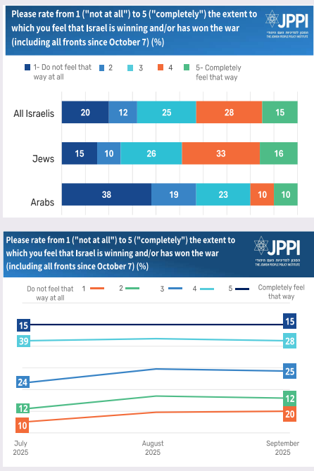 Compared with July–August, this month shows a slight erosion of the sense of achievement, perhaps because the Iran campaign – widely viewed as a success – has receded in time. In July, 18% of the general public said they strongly felt that Israel is winning; in August 17% gave this response. But in September, the share dropped to 15%. At the same time, the percentage who do not at all think Israel is winning rose from 17% in July to 20% in September. As the war continues without tangible gains, the public’s sense of victory erodes.