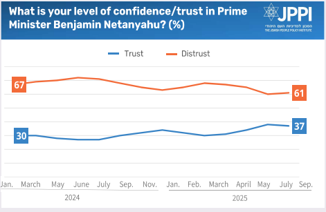 Compared to previous months, we find relative stability, although trust in Netanyahu ticked up slightly in the wake of the 12-day Iran campaign and remained elevated throughout the summer.