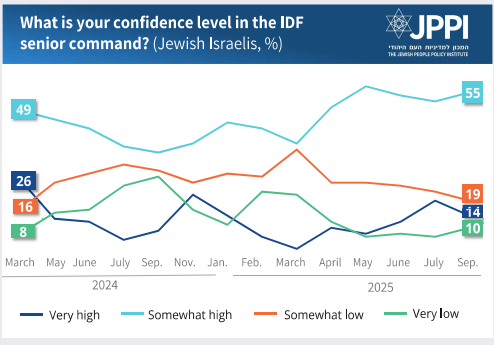 The question of trust in Israel’s political and military leadership remains central to the country’s public discourse. If there is an area where the monthly surveys have shown near-constant stability over many months, it is confidence in Prime Minister Benjamin Netanyahu, which remains low in September 2025. Given the (sometimes public) clashes between the political leadership and the senior military echelon, especially the chief of staff, it is notable that public trust in Netanyahu is lower than it is in the IDF.