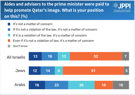 The September Israeli Society Index survey included a question about what the media calls “Qatargate” – a scandal in which connections came to light between Israelis close to the prime minister and Qatari funding or influencers. The affair is still under investigation. The survey found that a majority of Israelis (52%) think it is concerning even if it emerges, after the investigation, that no laws were broken. Twelve percent would find it concerning only if unlawful behavior could be proven. Nearly a third (29%) of respondents are unconcerned by the affair. Among Jewish Israelis, 61% think Qatargate is concerning in any case; among Arabs – 35%.