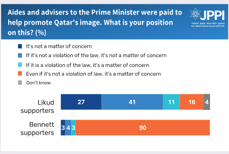 Broken down by political affiliation, Likud supporters are relatively unconcerned by the affair, while supporters of all the opposition parties and some of the coalition parties (Religious Zionism voters in particular – 47%) are concerned by it. In a comparison of the two parties that currently enjoy the most support, Likud and Naftali Bennett’s (still unnamed) party, we see how political orientation affects attitudes toward Qatargate.