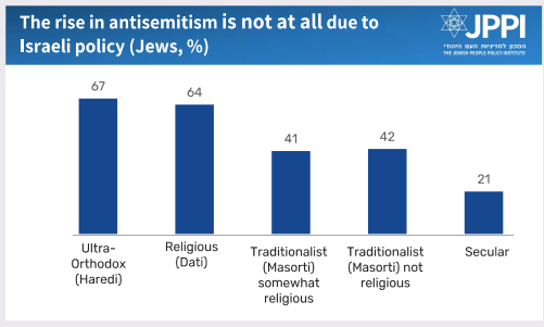Large differences are evident when responses are broken down by ideological orientation and religiosity level. In general, the further right on the political spectrum and the more religious, the higher the percentage of respondents who think there is no relationship between Israeli policy and rising antisemitism. Among religious and ultra-religious Jews, believe that rising antisemitism is not due to Israeli policy. Among secular Jews, by contrast, 43% say that the growth in antisemitism is largely due to Israeli policy, while another 32% think it is somewhat due to Israeli policy.