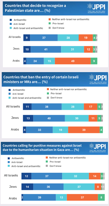 Ahead of the 2025 UN General Assembly, where several key countries (France, Australia, the UK, and others) are expected to advance an initiative to recognize a Palestinian state, we examined whether Israelis accept the claim voiced by some high-ranking Israeli officials that such an initiative is anti-Israel and/or antisemitic. Overall, a large majority of Israelis agree with this contention in one form or another. A quarter see the initiative as anti-Israel and antisemitic, over a third regard it as anti-Israel, and a tenth as antisemitic. Less than a quarter of Israelis believe that recognition of a Palestinian state at this time is neither anti-Israel nor antisemitic, and only a small percentage (4% of all Israelis, a tenth of Arab Israelis) regard it as a pro-Israel act.