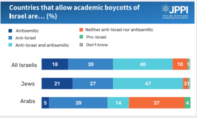 Another question in the vein related to academic boycotts of Israeli institutions. The percentage of Israelis who consider such actions antisemitic (rather than as only anti-Israel) again increased. Nearly half of Jewish Israelis regard such boycotts as both antisemitic and anti-Israel, while the share regarding them as solely antisemitic rises to 21% of Jewish respondents.