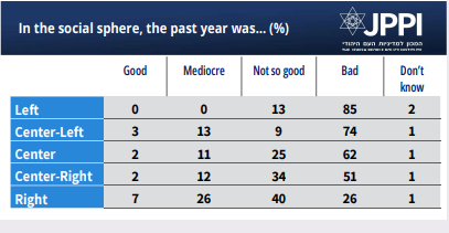 Regarding the social sphere, there is relative consensus. There is almost no difference in responses between Jews and Arabs. Although disparities exist between Jewish cohorts according to ideological orientation, a majority in all cohorts feel that the past year was either “not good” or “bad” in terms of social issues.