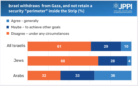 • Most Israelis are unwilling “under any circumstances” to give up on a security perimeter in Gaza.