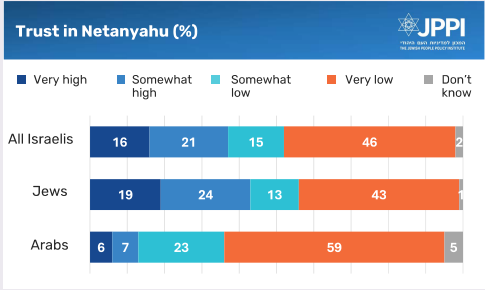 This month, overall, 37% of Israelis trust Netanyahu – a figure identical to July’s. However, the share who say their trust in him is “somewhat high” rose this month, while the percentage who say it is “very high” shrank. In September, nearly half of Israelis (46%) said their trust in the prime minister was very low. Only a third reported trusting him (16% “very high” and 21% “somewhat high”). Among Jews, the picture is slightly better: 43% say their trust in Netanyahu is very low, while 19% their trust in him is very high. Among Arabs, nearly six in ten (59%) express a total lack of trust in Netanyahu, with only 6% (notably all Christians or Druze) saying it is high.