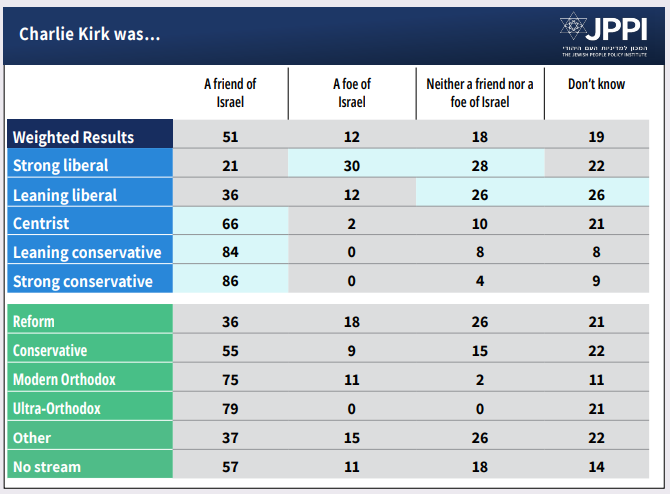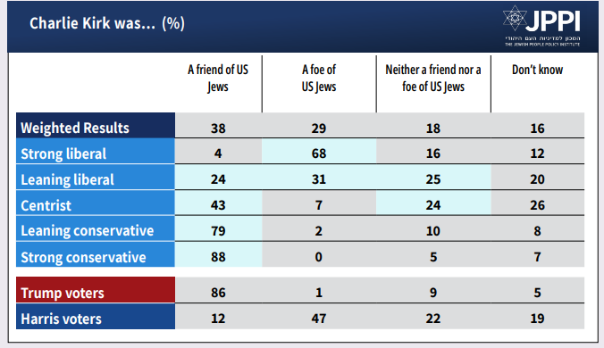 - 40% of respondents: Charlie Kirk was a “friend of American Jews”; a majority: a “friend of Israel.”