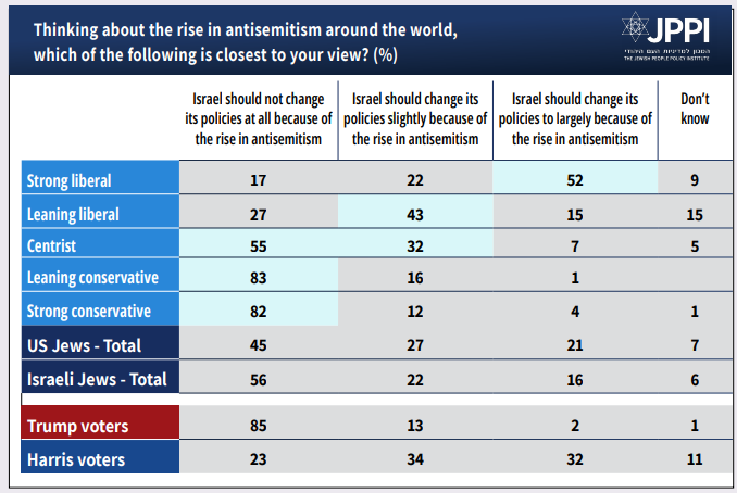 - Fewer than half believe Israel should change its policies because of rising antisemitism.