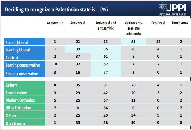 On this question, there is a conspicuous gap between the responses of Israeli Jews, as documented earlier this month in JPPI’s Israeli Society Index, and American Jews in the present survey. Nearly twice as many American Jews than their Israeli counterparts see recognition of a Palestinian state as neither anti-Israel nor antisemitic, or even pro-Israel (27% versus 15%).