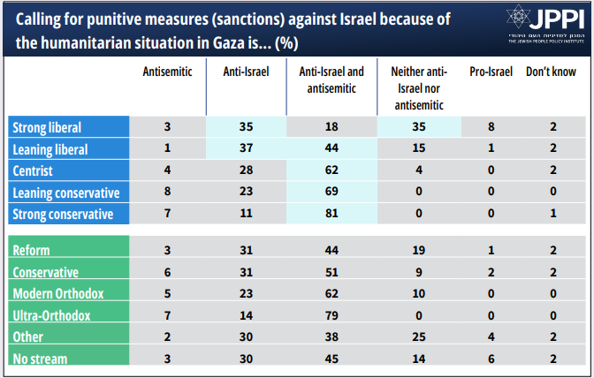 As with the previous question, the data here also point to a clear connection between ideological and religious identity and perceptions of calls to sanction Israel over the humanitarian situation in Gaza. The more politically conservative, the greater the tendency to view such calls as both anti-Israel and antisemitic.