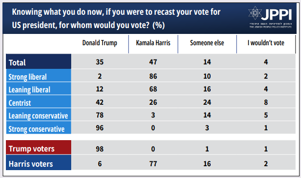 Among Trump voters, the response was unequivocal: 98% said they would vote for him again. By contrast, among Jewish Harris voters, the picture regarding Jewish Harris voters was less clear – 77% said they would vote for her again today, while 16% indicated they would now choose another candidate.