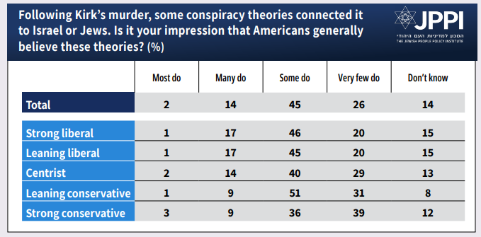 In the wake of Kirk’s assassination, various conspiracy theories spread, some of which linked the murder to Israel or to Jews (Prime Minister Netanyahu even responded to these assertions in a U.S. interview). Most respondents believe that some portion of the American public subscribes to such conspiracy theories, though it is not a large share. Nearly half of respondents (45%) think that “some” Americans believe conspiracy theories surrounding Kirk’s murder, while just one in seven (14%) believe that many Americans accept them, and only 2% think that most Americans believe them. About one-quarter (26%) estimate that “very few” Americans believe these theories. Liberals are slightly more inclined than conservatives to assume that many Americans believe the conspiracy theories around Kirk’s assassination.