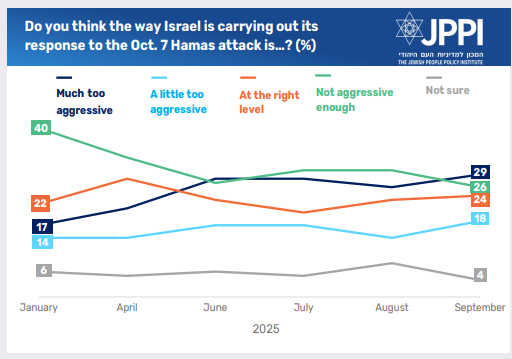 This month’s survey confirmed a continuing slow but steady rise in the share of respondents who believe that Israel’s response to the Hamas October 7 attack has been overly aggressive. In January, only 31% held this view, but the figure has now risen to 47%. At the same time, opinions at the opposite end of the spectrum have declined: at the beginning of 2025, two in five panel participants thought Israel’s response was not aggressive enough – today, just over a quarter (26%) still hold that view.