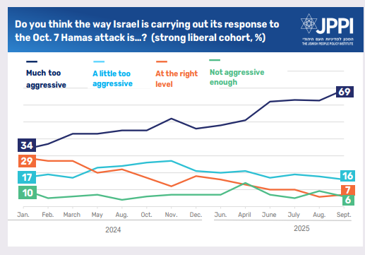 This month recorded the highest level (69%) since our measurements began in January 2024, among the strong liberal cohort (about 30% of survey respondents) who believe that Israel’s response to Hamas’s surprise attack has been “far too aggressive.” Compared with our measurement in January 2024, the share of strong liberals has doubled from 34% to 69%.