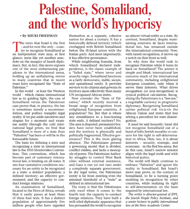 The news that Israel is the first – and for now the only – country to recognize Somaliland as an independent state may, at first glance, seem like yet another anecdote on the margins of Israeli diplomacy. But, in fact, this move exposes one of the most embarrassing paradoxes in the international arena, holding up an unflattering mirror to many countries that in recent years have recognized the “State of Palestine.”
