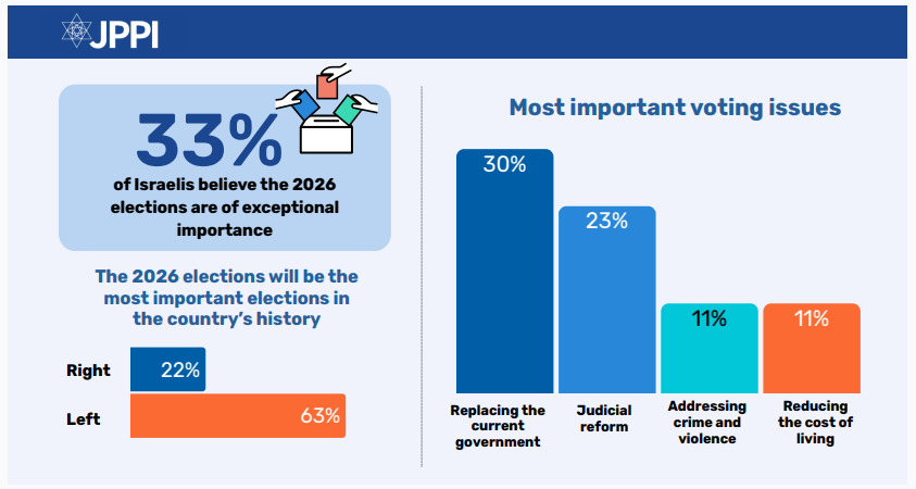One-third of Israelis believe that the 2026 elections will be the most important in the state’s history. Replacing the current government and judicial reform are the two issues the public considers most important in these elections.