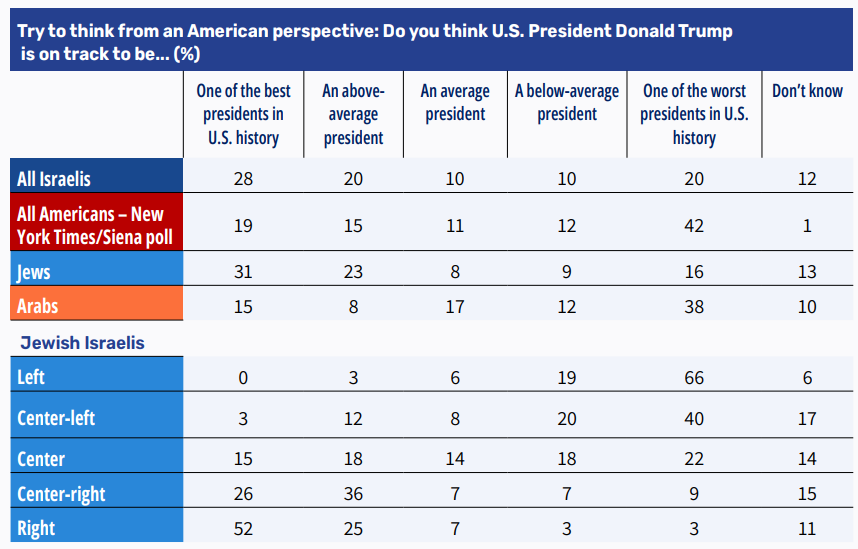 At the one-year mark of U.S. President Donald Trump’s second term, we examined how Israelis perceive his performance – both from an American perspective (insofar as Israelis can assess it) and from the Israeli perspective. The responses pertaining to the American perspective are compared with an identical question from a Siena College/New York Times poll published last month.