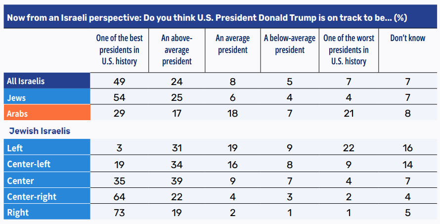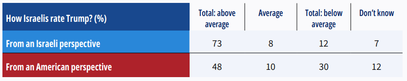 - Israelis are less likely than Americans to characterize Trump as a “bad” president.