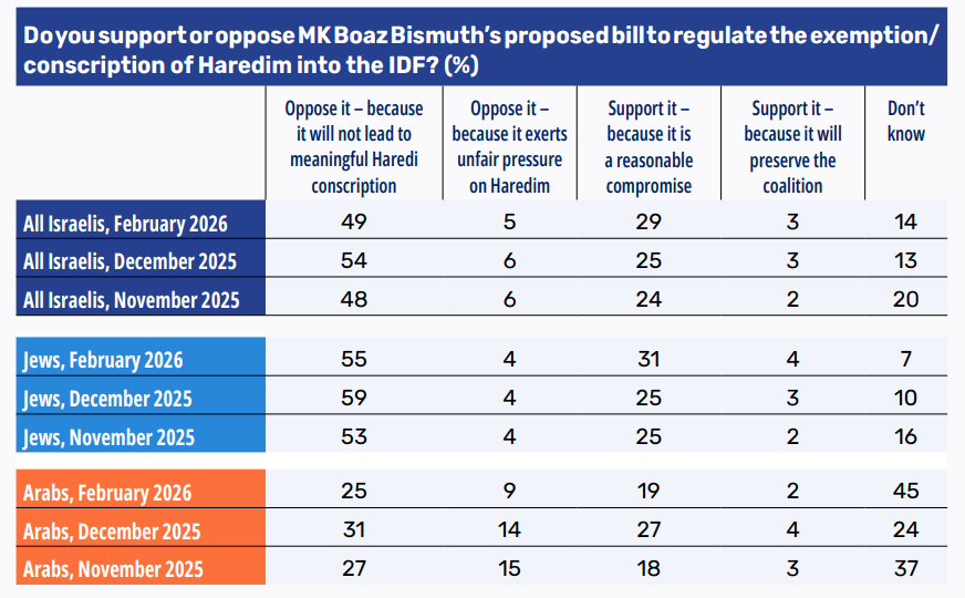 Most Israelis (54%) oppose the coalition’s proposed bill (the Bismuth Outline) to regulate the exemption/conscription of Haredim into the IDF. Forty-nine percent oppose it because they don’t think it will lead to meaningful Haredi conscription, and 5% oppose it because they think it exerts unfair pressure on Haredim. By contrast, one-third (32%) support the bill – 29% because they see it as a reasonable compromise, and 3% because they say passing the bill will preserve the coalition. Among Jewish Israelis, higher shares are recorded for both opponents (59%) and supporters of the bill (35%). Among Arab Israelis, by contrast, lower shares are recorded for both supporters (34%) and opponents (21%) of the Bismuth Outline; the explanation is that almost half (45%) did not know how to answer the question about the bill. Compared with JPPI’s December 2025 Israeli Society Index, there has been a slight decline (6 percentage points) in the share of Israelis opposing the bill, and a slight increase (4 percentage points) in the share supporting it. A breakdown by ideological orientation shows that a majority across all cohorts except the right-wing group oppose the bill because it will not lead to meaningful Haredi conscription (59% in the center-right, 83% in the center, 97% in the center-left, and 94% in the left-wing cohorts). Among right-wing respondents, 56% support the bill as a “reasonable compromise” and another 7% because it will “preserve the coalition” (overall, 63% support it, alongside a non-negligible 10% who answered “don’t know”).
