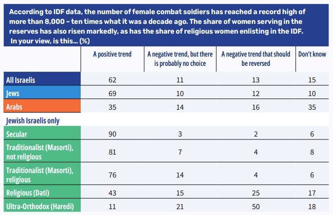 Most Israelis (62%) believe that the uptick in the number of female combat soldiers, women serving in the reserves, and religious women enlisting in the IDF is positive. Only a minority hold reservations about this trend. One-tenth (11%) think this is “not good news” but that “there is probably no choice” – that is, they would prefer the trend did not exist but assume security constraints make it necessary to accept it. One-eighth (13%) view it as a negative trend that should be reversed. Among Jewish Israelis, support for female combat soldiers and for women serving in the IDF is even higher: nearly seven in ten characterize the trend as positive. By contrast, Arab Israeli respondents have a far more reserved stance: one-third (35%) view the trend as positive, and an equal share indicated that they do not know.
