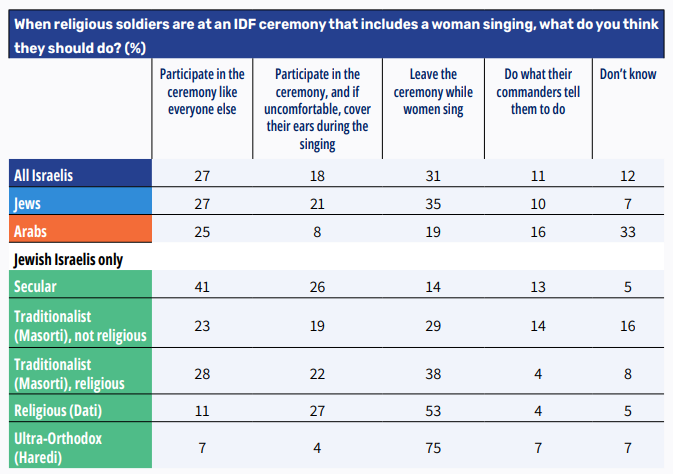 Against the backdrop of recent cases that generated a sense of tension between women’s service in the IDF and religious sensitivities, the question has again arisen as to how religious soldiers should act in situations where they perceive a contradiction between the demands made of them by the army and Halacha (Jewish law). In this context, we examined what the Israeli public thinks religious soldiers should do at an IDF ceremony that includes a woman singing.