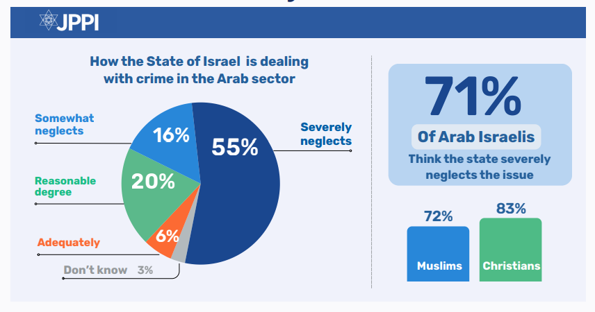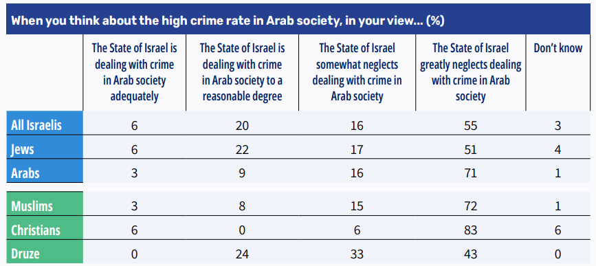 An internal breakdown of Arab respondents shows that Muslims and Christians, in particular, express an acute sense of neglect (72% and 83%, respectively), but the picture is more complex among Druze respondents, with a higher proportion believing the state’s response has been reasonable. Overall, the data reveal a lack of trust in the state’s ability or willingness to confront crime in Arab society effectively – particularly among Arab Israelis themselves.