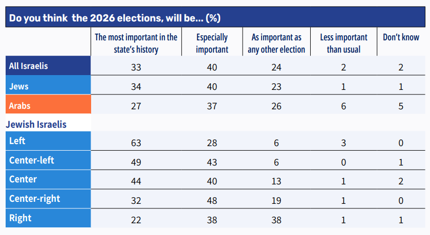 - 73% of Israelis believe the 2026 elections are of exceptional importance.
