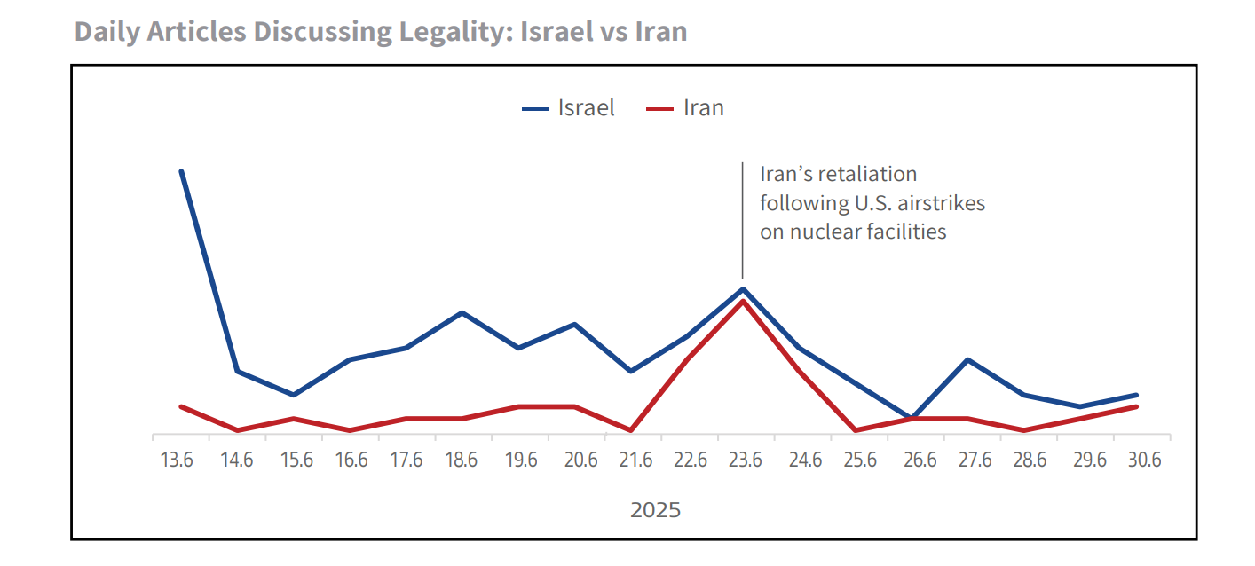 However, this picture is incomplete: A substantial portion of media references to “legality” were merely quotations of official accusations made by either side against the other (e.g., Iranian or Israeli claims that harm to civilians constitutes a war crime), or self-justifications of their own actions (e.g., Iran claiming it acted under the “right to self-defense”).
