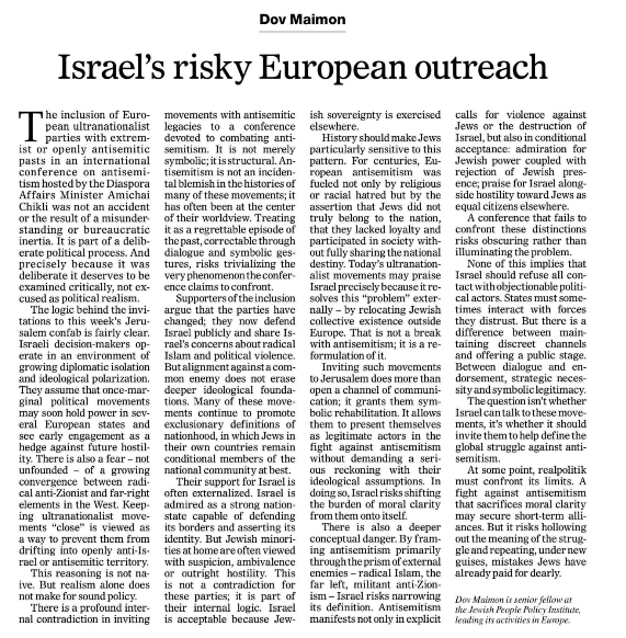 The inclusion of European ultranationalist parties with extremist or openly antisemitic pasts in an international conference on antisemitism hosted by the Diaspora Affairs Minister Amichai Chikli was not an accident or the result of a misunderstanding or bureaucratic inertia. It is part of a deliberate political process. And precisely because it was deliberate it deserves to be examined critically, not excused as political realism.