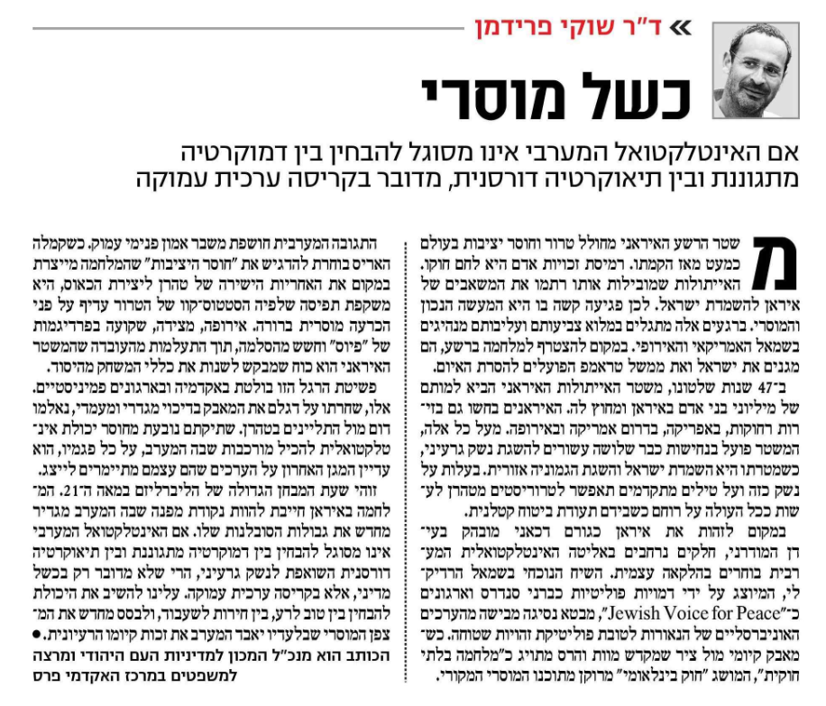 פשיטת הרגל הזו בולטת באקדמיה ובארגונים פמיניסטיים. אלו, שחרתו על דגלם את המאבק בדיכוי מגדרי ומעמדי, נאלמו דום מול התליינים בטהרן. שתיקתם נובעת מחוסר יכולת אינטלקטואלית להכיל מורכבות שבה המערב, על כל פגמיו, הוא עדיין המגן האחרון על הערכים שהם עצמם מתיימרים לייצג. זוהי שעת המבחן הגדולה של הליברליזם במאה ה־21. המלחמה באיראן חייבת להוות נקודת מפנה שבה המערב מגדיר מחדש את גבולות הסובלנות שלו.