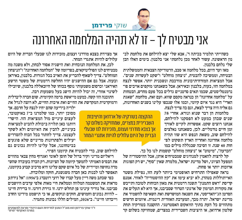 לכן, את המלחמה הנוכחית ואת הישגיה אסור לבחון, ולא משנה מה מבטיחים לנו הפוליטיקאים, בפריזמה של ״המלחמה האחרונה״ ו״הניצחון המוחלט״. צריך לשאוף להכריע את האויב בכל הגזרות. בלבנון, באיראן ובעזה. אבל גם אם ההישגים יהיו החלשה דרמטית של משטר הרשע האיראני וכרסום משמעותי נוסף בכוחו של חיזבאללה בלבנון, שיובילו לשינוי אזורי, זה יכול להיות הישג בעל משמעות רבה.