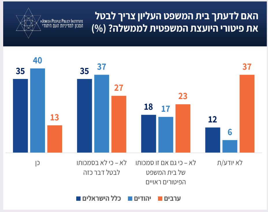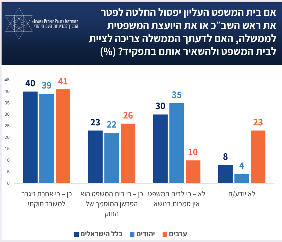 מרבית הישראלים חושבים שאם תתקבל החלטה לפטר את היועצת המשפטית לממשלה, גלי בהרב-מיארה, מהלך שהממשלה הכריזה על כוונה לבצע אך טרם הביאה למימוש – בית המשפט העליון לא צריך לבטל את הפיטורים. 35% סבורים שאין זה בסמכותו של בית המשפט לבטל מהלך כזה, ו-18% מאמינים שגם אם זו סמכותו לעשות זאת, הפיטורים של של היועצת המשפטית לממשלה ראויים. מרבית המשתייכים לקבוצות ה"שמאל" (87%) "שמאל מרכז" (81%) ו"מרכז" (68%) חושבים שבית המשפט צריך לבטל את פיטורי היועצת המשפטית לממשלה אם וכאשר ימומשו. מרבית המשתייכים לקבוצת "ימין מרכז" (60%) ו"-ימין" (88%) סבורים שבית המשפט העליון לא צריך לבטל את פיטורי היועצת המשפטית לממשלה. שניים מכל שלושה בקבוצת הימין סבורים שאין זה בסמכותו של בית המשפט העליון לעשות זאת. למול הקביעה של רוב הציבור כי על בית המשפט להימנע מהתערבות בהליכי הפיטורים של שני הפקידים הבכירים, עומדת קביעה של רוב גדול יותר הקובע כי על הממשלה לכבד החלטה של בית המשפט – אם תהיה כזאת – לבטל את הפיטורים. 40% נימקו את תשובתם המחייבת ציות לבית המשפט בבחירת האפשרות "כי אחרת נגרר למשבר חוקתי," ו-23% נוספים נימקו את עמדתם בבחירת האפשרות ש״בית המשפט הוא הפרשן המוסמך של החוק״. אחד מכל שלושה ישראלים סבור, שאם בית המשפט העליון יפסול החלטה לפטר את ראש השב"כ או את היועצת המשפטית לממשלה, הממשלה לא צריכה לציית לבית המשפט, מכיוון שלבית המשפט אין סמכות בנושא. בקרב הערבים מעט יותר מעשירית סבורים שלבית המשפט אין סמכות בנושא, ורבע השיבו כי הם לא יודעים לענות על שאלה זו.