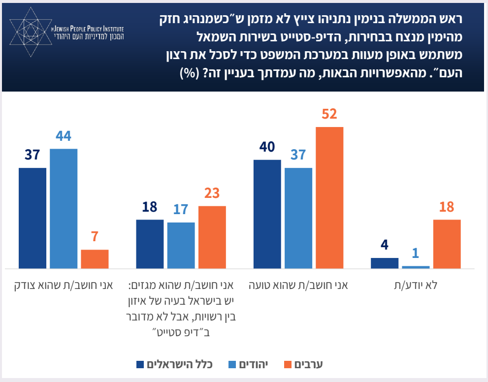 המונח ״דיפ סטייט״ משמש בחודשים האחרונים בשיח הישראלי לעיתים תכופות, כטענה של חלק מההנהגה הישראלית נגד ראשי המערכות הציבורית במדינה. לפני מספר שבועות ראש הממשלה פרסם ברשתות החברתיות את האמירה ״כשמנהיג חזק מהימין מנצח בבחירות, הדיפ-סטייט בשירות השמאל משתמש באופן מעוות במערכת המשפט כדי לסכל את רצון העם״. בסקר עשינו שימוש באמירה זו כדי לבחון האם ועד כמה הציבור מסכים עם מסגור דפוס ההתנהלות המדינתי כמצב של ״דיפ סטייט״ השולט למעשה במערכות ומנטרל את כוחם של נבחרי הציבור לממש את רצון הציבור.