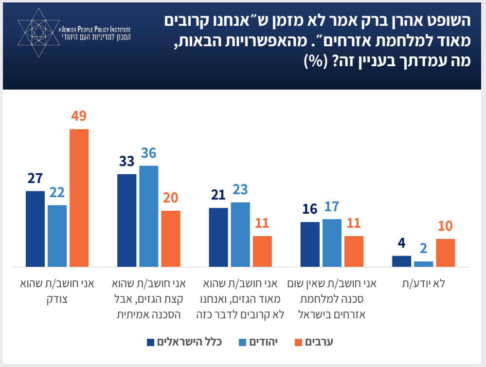 מחצית מהערבים בישראל סבורים שהשופט ברק צודק באמירתו כי ישראל קרובה למלחמת אזרחים. בסך הכל, 60% מכלל הישראלים, ו-58% מכלל היהודים סבורים כי הסכנה של מלחמת אזרחים ממשית (סבורים שברק צודק + שהגזים אבל הסכנה אמיתית).
