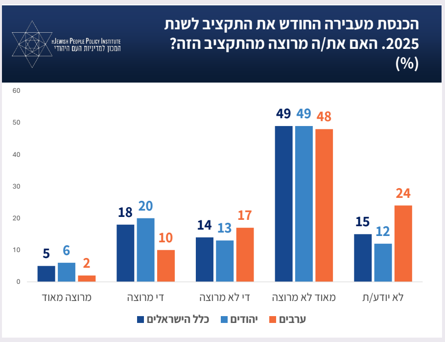 סקר המכון למדיניות העם היהודי נערך לקראת סוף חודש מרץ, בעת שהכנסת העבירה את תקציב המדינה לשנת 2025. לגיבוש התקציב נלוותה ביקורת ציבורית ומקצועית נרחבת. סקר המכון למדיניות העם היהודי (JPPI) מצא שרוב הציבור בישראל, יהודים וערבים, לא מרוצה מהתקציב לשנת 2025. כרבע מהציבור, ורבע מהיהודים, מעידים כי הם מרוצים (די מרוצים + מאוד מרוצים) מהתקציב. בקרב הערבים, אחד מכל שמונה מרוצה (די מרוצה + מאוד מרוצה) מתקציב המדינה לשנת 2025.