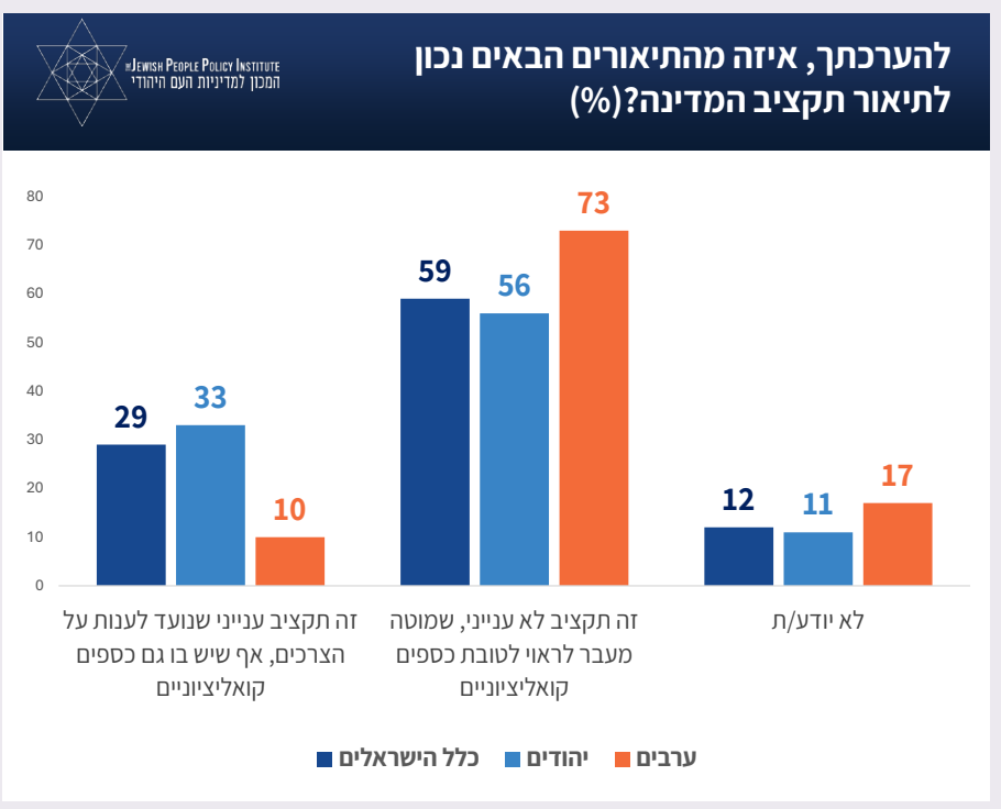 מרבית הציבור בישראל, יהודים וערבים, חושב שתקציב המדינה לשנת 2025 הוא תקציב לא ענייני, שמוטה ״מעבר לרצוי״ לטובת כספים קואליציוניים. בקרב היהודים שליש סבורים שהתקציב ענייני ונועד לענות על צרכי המדינה, אף שיש בו גם כספים קואליציוניים. בקרב הערבים אחד מכל עשרה סבור שמדובר בתקציב ענייני. מרבית המזדהים כתומכי הקבוצות ימין-מרכז (57%) מרכז (86%) שמאל-מרכז (96%) ושמאל (94%) סבורים שהתקציב לא ענייני. מנגד, מרבית המזדהים עם קבוצת הימין (57%) סבורים שהתקציב ענייני, ונועד לענות על הצרכים, למרות שיש בו גם כספים קואליציוניים. מרבית מצביעי הליכוד, הציונות הדתית, ש"ס ויהדות התורה בבחירות 2022 חושבים כך גם הם. לעומת זאת רוב מצביעי יש עתיד, המחנה הממלכתי, ישראל ביתנו, העבודה ומרצ, סבורים כי התקציב לא ענייני.