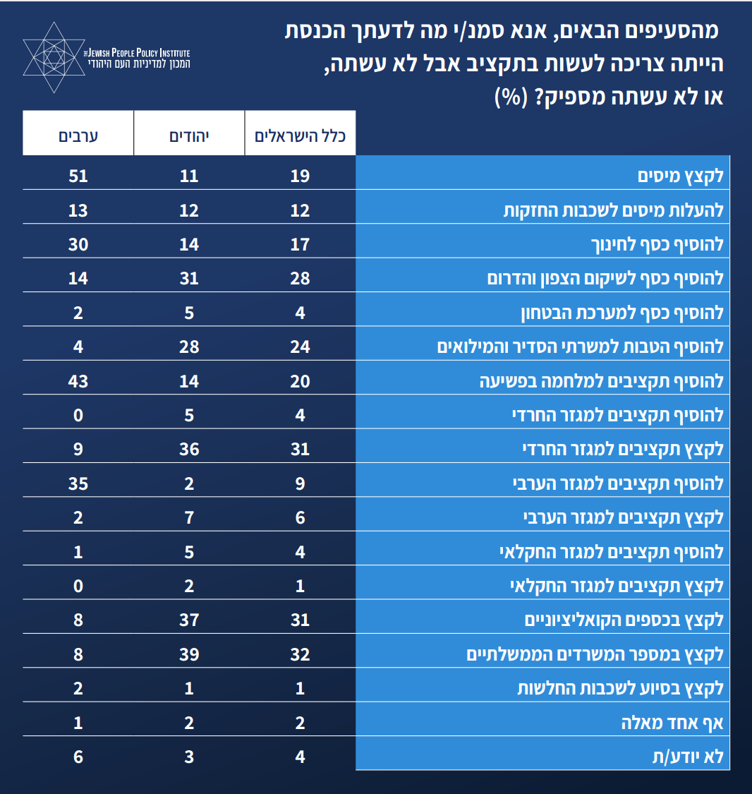 בסקר הצגנו למשיבים אפשרות לומר מה הכנסת הייתה צריכה לעשות בתקציב המדינה ולא עשתה, או לא עשתה מספיק. כל אחד מהמשיבים סימן עד 3 פריטים שהם אלה שחסרים בעיניו יותר מאחרים. כשליש מהמשיבים סימנו בעדיפות גבוהה את האפשרות של קיצוץ בתקציבים לחרדים (31%) קיצוץ בכספים הקואליציוניים (31%) וקיצוץ במספר המשרדים הממשלתיים. (32%) כרבע סימנו תוספת תקציב לשיקום הדרום והצפון (28%) ותוספת הטבות למשרתי הסדיר והמילואים .(24%) אחד מכל חמישה ישראלים חושב שצריך לקצץ במיסים, להוסיף תקציבים למלחמה בפשיעה או להוסיף כסף לחינוך. מחצית מהערבים (51%) סבורים שנדרש קיצוץ במיסים, 43% מהם סימנו תוספת תקציבים למלחמה בפשיעה, 35% סימנו תוספת תקציבים למגזר הערבי ו-30% סימנו תוספת כסף לחינוך.