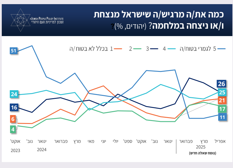 לפני חודשיים שינינו את נוסח השאלה על רמת הביטחון בניצחונה של ישראל במלחמה. במקום לשאול על המלחמה שאלת עתיד – מה רמת הביטחון שישראל תנצח במלחמה, אנחנו שואלים על רמת הביטחון ביחס להווה – "״כמה את/ה מרגיש/ה שישראל מנצחת ו/או ניצחה במלחמה?״. שינוי זה הוביל לפער ניכר בתשובות המשיבים בחודשיים הללו.