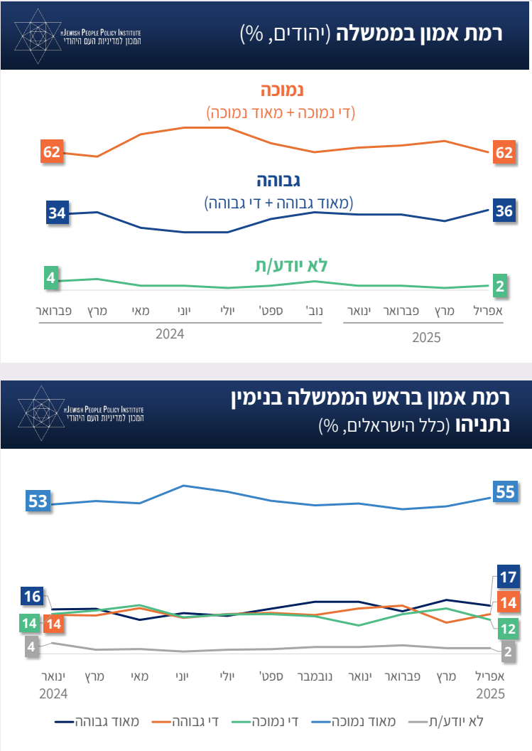 ביחס לחודש שעבר חלה עלייה של 5% בשיעור היהודים שמעידים כי רמת האמון שלהם בממשלה גבוהה, וירידה של 5% בשיעור אלו מהם שמעידים כי אמת האמון שלהם בממשלה נמוכה. בקרב הערבים, 86% מעידים כי רמת האמון שלהם בממשלה נמוכה. אחד מכל עשרה מעיד כי רמת האמון שלו בממשלה גבוהה. בחלוקה אידאולוגית, נרשם רוב בכלל הקבוצות, מלבד הימין, שרמת האמון שלהם בממשלה נמוכה. בקרב המשתייכים לקבוצת הימין, שיעור המשיבים שרמת האמון שלהם נמוכה עומד על שליש (33%). מרבית הישראלים (55%) מעידים כי רמת האמון שלהם בראש הממשלה בנימין נתניהו "מאוד נמוכה." מנגד כחמישית (17%) טוענים שרמת האמון שלהם בו "מאוד גבוהה." גם בסוגייה זו נרשם רוב בכלל הקבוצות האידאולוגיות, מלבד הימין, שרמת האמון שלהם בראש הממשלה נמוכה (מאוד נמוכה + די נמוכה). בקבוצת הימין כשליש (31%) מעידים כך. מרבית המשתייכים לקבוצת הימין (68%) השיבו כי רמת האמון שלהן בנתניהו גבוהה. עם זאת, 20% ממצביעי הליכוד ו-31%ממצביעי הציונות הדתית (לפי הצבעה בבחירות 2022) מעידים כי רמת האמון שלהם בראש הממשלה נמוכה. רוב הישראלים (65%) מעידים שרמת האמון שלהם בשר הביטחון, ישראל כץ, נמוכה (מאוד נמוכה + די נמוכה), ושליש (32%) אומרים שרמת האמון שלהם גבוה (מאוד גבוהה + די גבוהה). מחצית מהיהודים (47%) בישראל אומרים שרמת האמון שלהם בשר הביטחון "מאוד נמוכה," חמישית (17%) טוענים שהיא "מאוד גבוהה." שניים מכל שלושה ערבים בישראל מעידים שרמת הביטחון שלהם בשר הביטחון "מאוד נמוכה" ו17%- נוספים מעידים שהיא "די נמוכה."