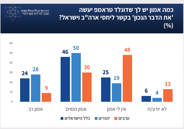 רבע מהישראלים מעידים כי יש להם אמון רב בכך שנשיא ארה"ב יעשה ״את הדבר הנכון״ בקשר ליחסי ארה"ב וישראל. רבע מעידים כי אין להם אמון בכך, ו-46% מעידים כי יש להם אמון מסוים. ככלל, רמת האמון של היהודים בישראל בנשיא גבוהה משמעותית מזו של הערבים. כרבע מהיהודים (28%) מעידים כי יש להם אמון רב שטראמפ יעשה את הדבר הנכון, וחמישית (19%) מעידים כי אין להם אמון. אחד מכל עשרה ערבים מעיד כי יש לו או לה אמון רב שטראמפ יעשה את הדבר הנכון בהקשר ליחסים בין המדינות, ואילו אחד משניים טוען כי אין לו אמון בכך. ביחס לחודש שעבר חלה ירידה בשיעור הערבים שמעידים כי יש להם אמון רב שטראמפ יעשה את הדבר הנכון. בעוד שבחודש שעבר 20% מהם השיבו כך, החודש עשו זאת 9% בלבד.