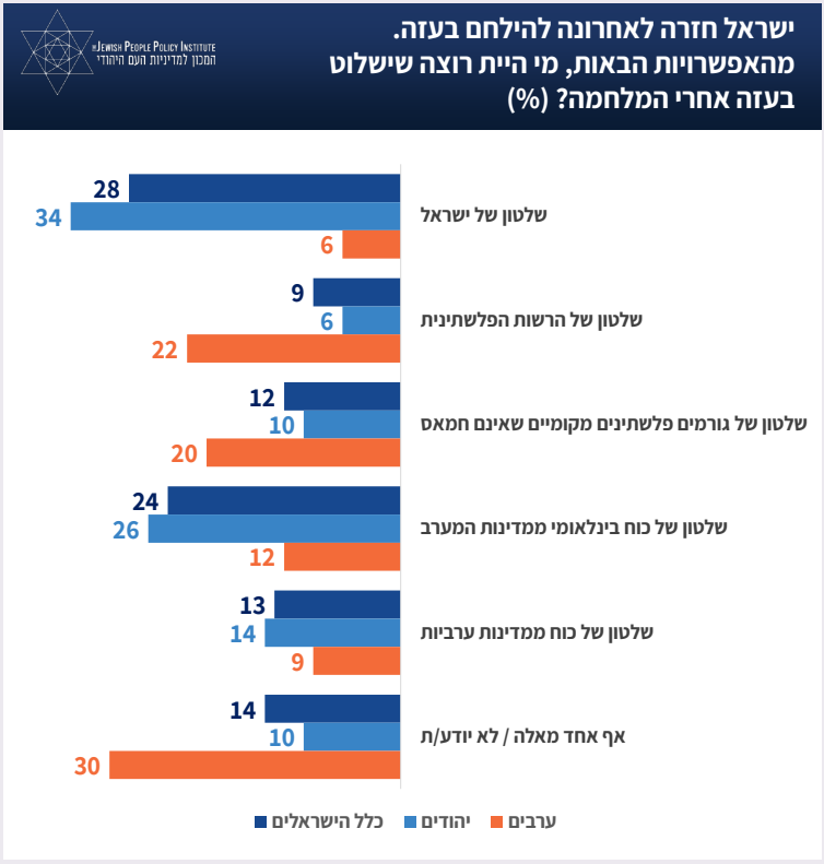 בחודש האחרון חודשה הלחימה ברצועת עזה על ידי ישראל. החודש חזרנו לבחון מי הציבור הישראלי היה רוצה שישלוט בעזה אחרי המלחמה. כרבע מהישראלים (28%) היו רוצים שלטון של ישראל ברצועת עזה, רבע נוסף (24%) מעדיפים שלטון של כוח בינלאומי ממדינות המערב, שמינית (13%) שלטון של כוח ממדינות ערביות, ושמינית (12%) היו רוצים שגורמים פלשתינים מקומיים שאינם חמאס ישלטו ברצועת עזה לאחר סיום המלחמה. בקרב היהודים נרשם שיעור גבוה יותר של מי שמעדיפים שלטון ישראלי (34%) ובקרב הערבים נרשם שיעור גבוה יותר (22%) של מי שרוצים שלטון של הרשות הפלשתינית ברצועת עזה. בחלוקה אידאולוגית, שני שליש מהמשתייכים לקבוצת ה"ימין" היו רוצים שישראל תשלוט בעזה אחרי המלחמה. שליש מהמשתייכים ל"ימין מרכז" סבורים כמותם, ושליש מהתומכים ב״ימין מרכז״ מעדיפים שלטון של כוח בינלאומי ממדינות המערב. שליש ממצביעי המרכז מעדיפים גם הם את האפשרות של שליטה של כוח בינלאומי ממדינות המערב. רבע מהמשתייכים לקבוצת ה"שמאל מרכז" רוצים שלטון של כוח ממדיניות ערביות, ושליש מהמשתייכים לקבוצת ה"שמאל" מעדיפים את האפשרות של שלטון של הרשות הפלשתינית.