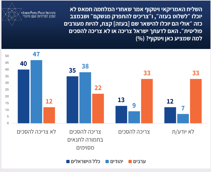 באותו הקשר, כללנו בסקר אמירה של השליח האמריקאי סטיב ויטקוף, שלפיה אחרי המלחמה חמאס לא יוכלו ״לשלוט בעזה״, ו״צריכים להתפרק מנשקם״ אבל שבמצב כזה ״אולי הם יוכלו להישאר שם [בעזה] קצת, להיות מעורבים פוליטית״. שניים מכל חמישה ישראלים סבורים שישראל לא צריכה לסכים למה שמציע ויטקוף, 35% סבורים שעליה להסכים לכך בתמורה לתנאים מסוימים ו-13% סבורים שישראל צריכה להסכים להצעתו של השליח האמריקאי. כמחצית מהיהודים בישראל (47%) סבורים שישראל לא צריכה להסכים להצעה זו ואילו פחות מעשירית סבורים שישראל צריכה להסכים לה. שליש מהערבים סבורים שישראל צריכה להסכים להצעתו של ויטקוף, חמישית חושבים שהיא צריכה להסכים בתמורה לתנאים מסוימים ושמינית מאמינים שישראל לא צריכה להסכים להצעה זו.