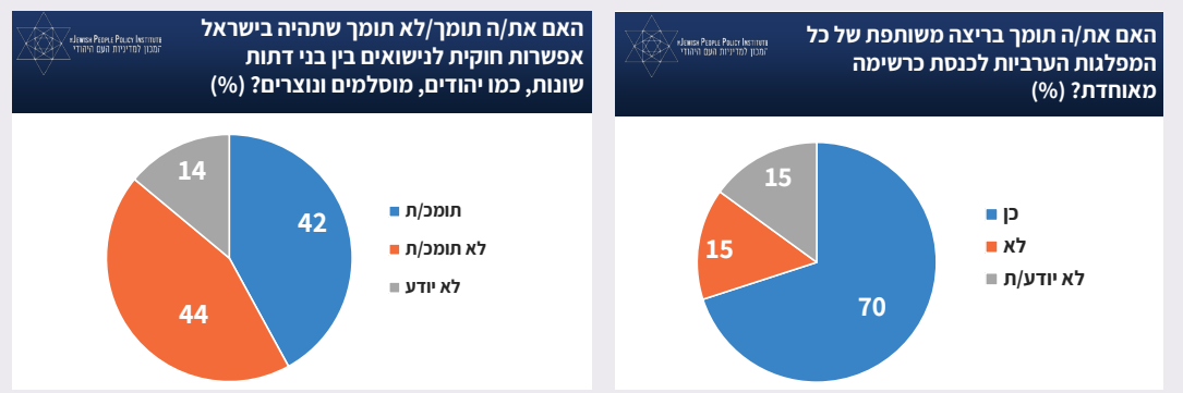החודש בחנו שתי שאלות בנפרד רק בקרב האוכלוסייה הערבית. שבעה מכל עשרה ערבים בישראל תומכים בריצה משותפת של כל המפלגות הערביות לכנסת כרשימה מאוחדת. 15% מתנגדים למהלך זה ו-15% נוספים לא יודעים מה עמדתם בנוגע לשאלה זו. בקרב הערבים בישראל אין הסכמה ביחס לשאלת התמיכה באפשרות חוקית לנישואים בן בני דתות שונות. 44% מהערבים בישראל לא תומכים באפשרות זו, ואילו 42% תומכים בה.