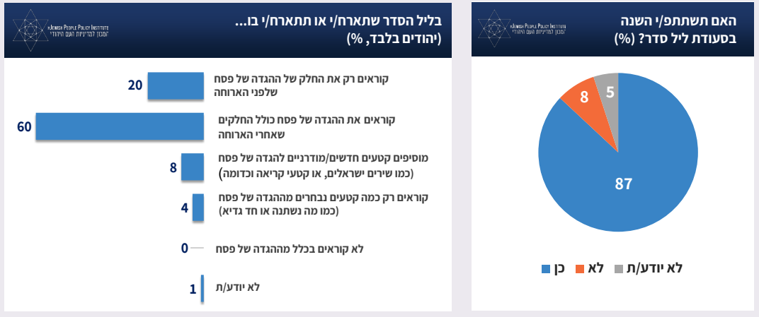 רוב היהודים בישראל (87%) צפויים להשתתף השנה בסעודת ליל הסדר. לפי סקר "קול העם" של המכון למדיניות העם היהודי בקרב משיבים יהודים בארה״ב, שיעור דומה של יהודים בישראל ושל יהודים ״מחוברים״ בארה"ב (82%) צפויים להשתתף השנה בסעודת ליל סדר.