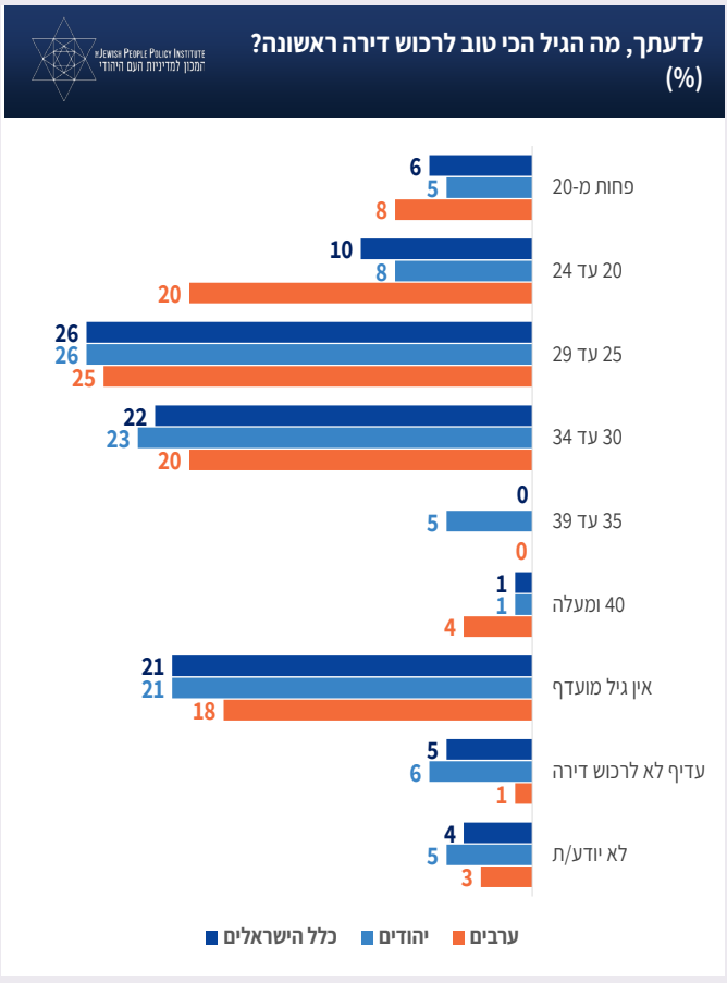 במקביל לפרסום סקר בינלאומי של מכון הסקרים האמריקאי ״פיו״, בדקנו החודש באיזה גיל הציבור בישראל חושב שהכי טוב להגיע לכמה נקודות ציון משמעותיות בחיים. את הנתונים שהתקבלו השווינו לסקר הזהה במדינות אחרות בעולם. רבע מהישראלים (26%) סבורים שנכון לרכוש דירה ראשונה בטווח הגילאים 25-29 רבע נוסף (22%) סבורים שהגיל המתאים לעשות זאת הוא 30-34 אחד מכל חמישה ישראלים חושב שאין גיל מועדף לקניית דירה ראשונה, ואחד מכל עשרה חושב שהגיל המתאים לקניית דירה ראשונה הוא 20-24, בקרב הערבים בישראל שיעור גבוה יותר חושב שהזמן המתאים ביותר לרכישת דירה ראשונה הוא טווח הגילאים 20-24 אחד מכל חמישה חושב כך.