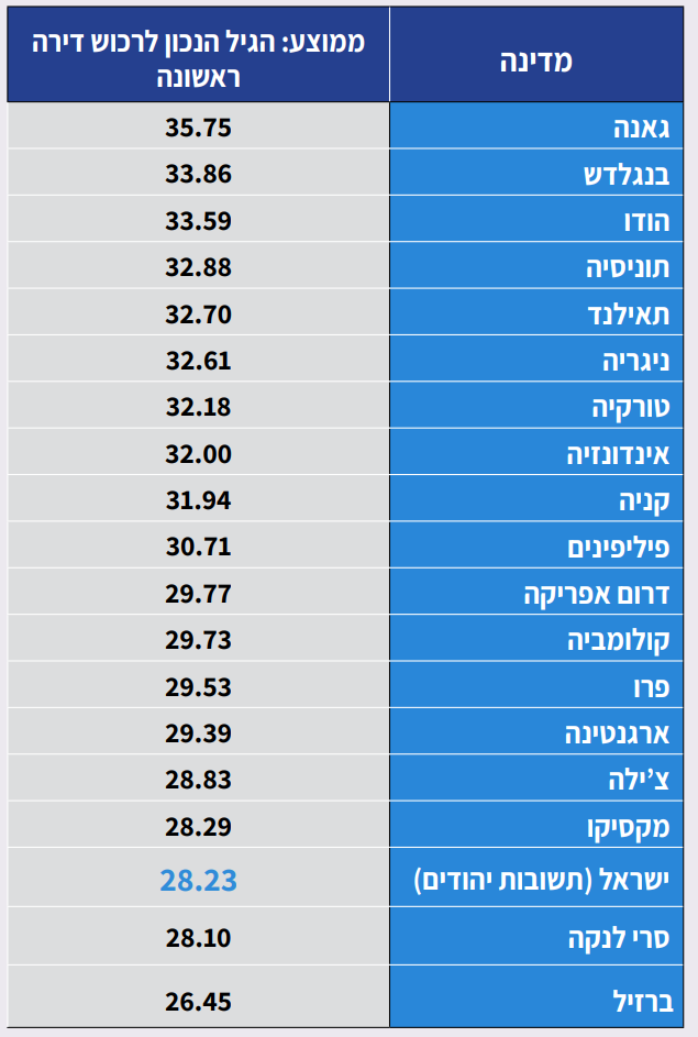 הסקר של מכון המחקר ״פיו״ כלל 18 מדינות, רובן בעולם המתפתח. בהשוואה אליהן ישראל היא אחת משלוש המדינות שבהן הגיל הממוצע לרכישת דירה הוא הצעיר ביותר. בקרב היהודים בישראל, ממוצע הגיל בסקר שערכנו עמד על 28.23 נתון דומה לזה שנרשם במקסיקו ובסרי לנקה.