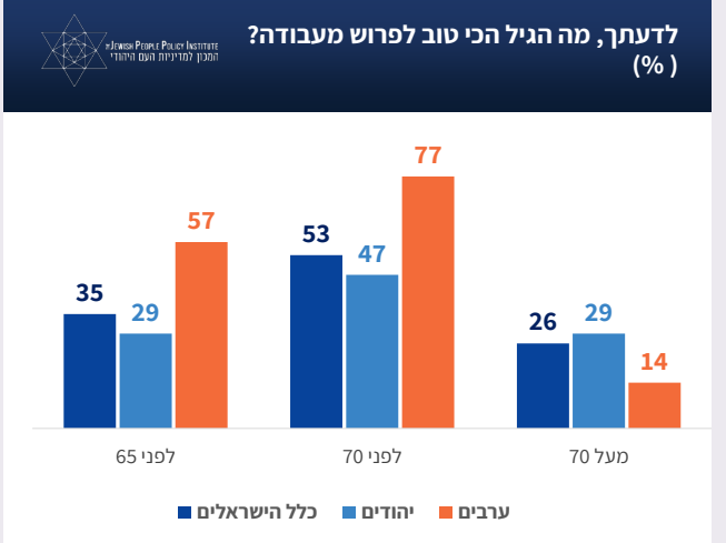 שליש מהישראלים (35%) סבורים שהגיל הנכון לפרישה מהעבודה הוא לפני גיל 65 מחצית (53%) סבורים שהזמן הנכון לפרוש מעבודה הוא לפני גיל 70 ורבע (26%) חושבים שהגיל הכי טוב לפרישה מעבודה הוא מעל 70. בתשובה לשאלה זו יש פערים משמעותיים בין תשובות היהודים לתשובות הערבים –הגיל "הכי טוב" לפרישה בעיני הערבים נמוך משמעותית לעומת היהודים. מרבית הערבים (57%) חושבים שהגיל הטוב ביותר לפרישה הוא לפני 65. 77% מהם סבורים שהגיל הנכון לעשות זאת הוא לפני 70 (לעומת 47% מהיהודים שחושבים כך), ואילו 14% מאמינים שהגיל הטוב ביותר לפרישה הוא מעל 70 (לעומת 29% מהיהודים שחושבים כך).