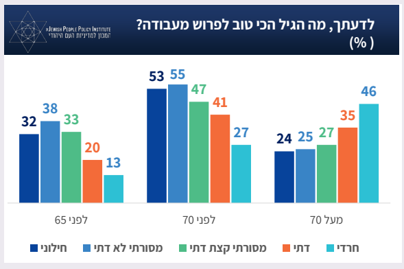 שימו לב: הנתונים של ״לפני 65״ ו״לפני 70״ הם נתונים מצטברים. כלומר, מי שאמרו ״לפני 65״ נכללים גם בסך הכל של ״לפני 70״. מהנתונים עולה כי ישנם פערים בהעדפות הפרישה גם על פי דתיות בקרב היהודים. ככול שמתקדמים על הסקלה הדתית מהכיוון הליברלי לכיוון השמרני, עולה שיעור מי שהשיבו שגיל הפרישה הכי טוב הוא מעל 70. כלומר, ביחס לחילונים ולמסורתיים שיעור גבוה יותר של דתיים וחרדים חושבים שנכון לפרוש מעבודה בשלב מאוחר יותר. מרבית החילונים והמסורתיים הלא דתיים חושבים שגיל הפרישה הנכון הוא לפני 70. מחצית מהמסורתיים-דתיים, 41% מהדתיים וכרבע מהחרדים סבורים כך גם הם. כמעט מחצית מהחרדים ושליש מהדתיים חושבים שהכי טוב לפרוש מעל גיל 70.